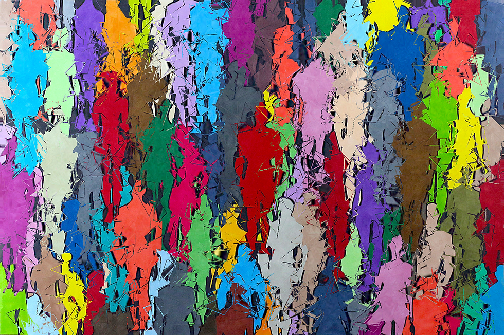 Non so se vi ricordate, ma qualche post fa avevo scritto un mappazzone sulla storia delle sagome, e per farlo avevo usato un quadro: “Colored Crowd”. Ebbene, questa è una versione digitalizzata e distorta di quel quadro, io la adoro.